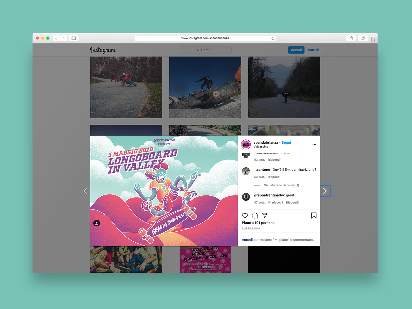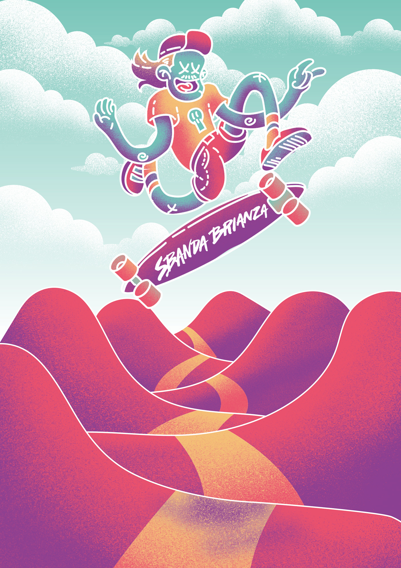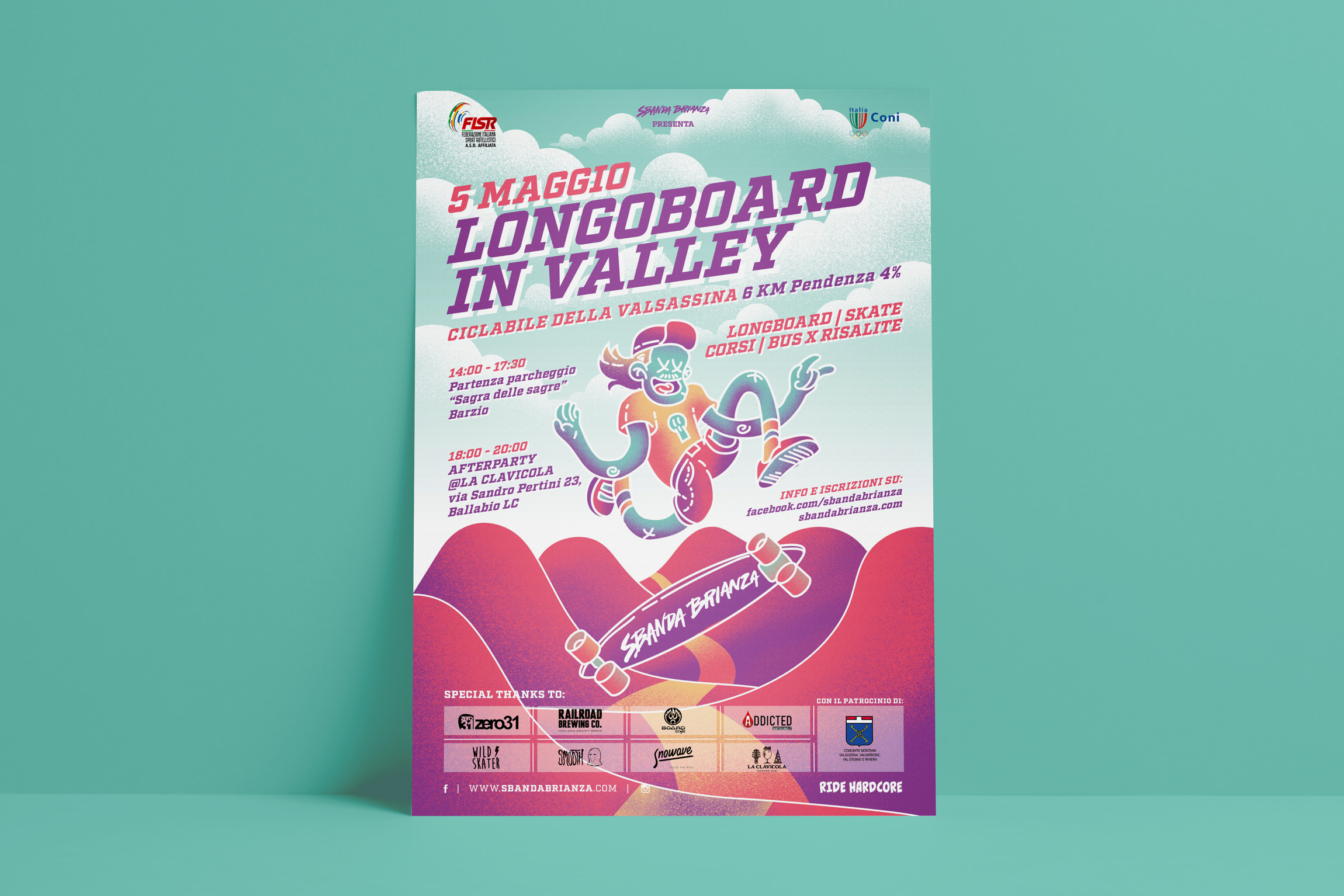Para Longboard in Valley, evento de freeride no competitivo organizado por Sbanda Brianza, realicé la ilustración del cartel oficial. El evento se celebra en la Valsassina, un hermoso valle alpino situado entre el Lago de Como y las montañas Grigne, y está pensado como una fiesta sobre la tabla, más que como una competición.