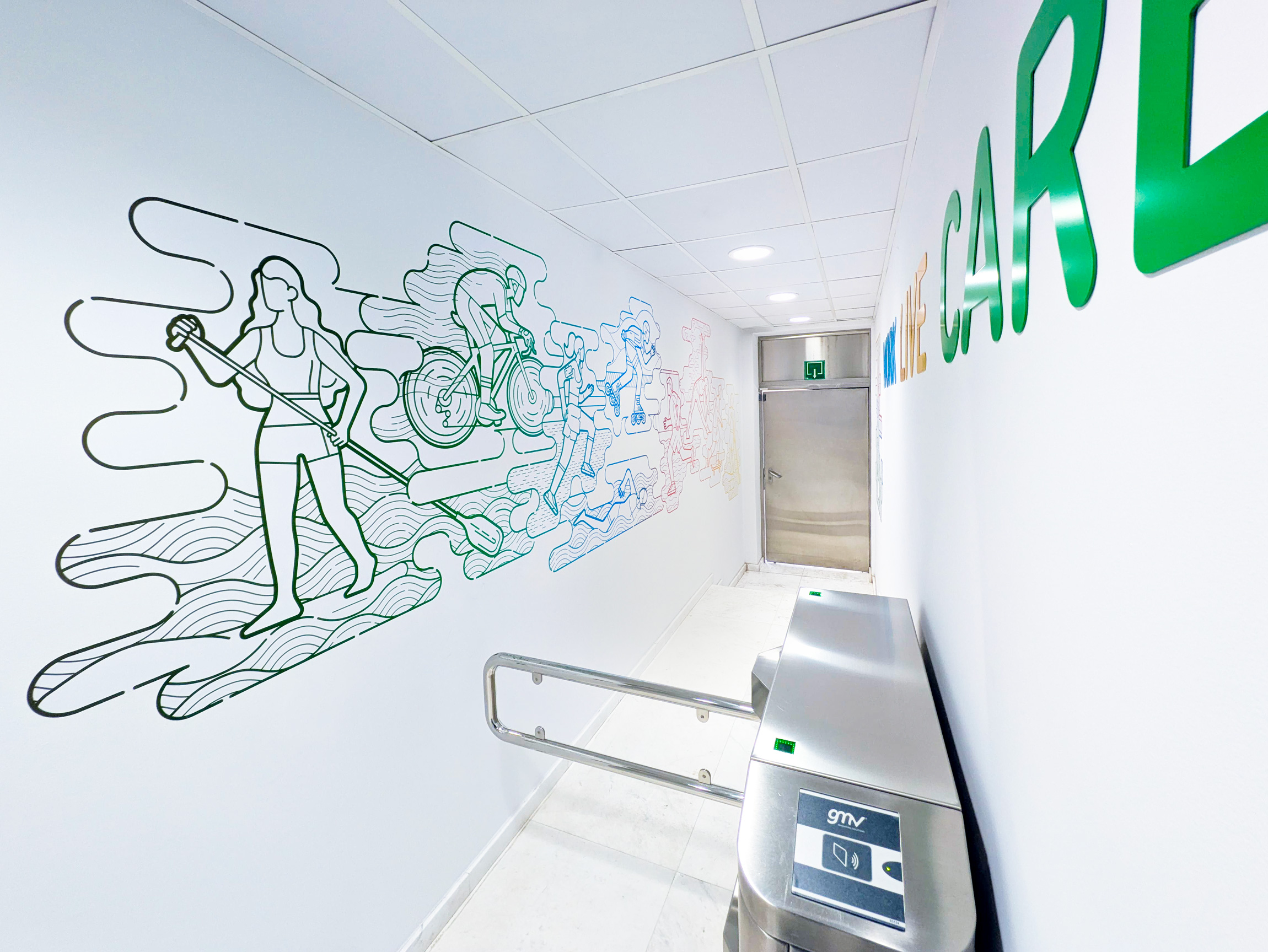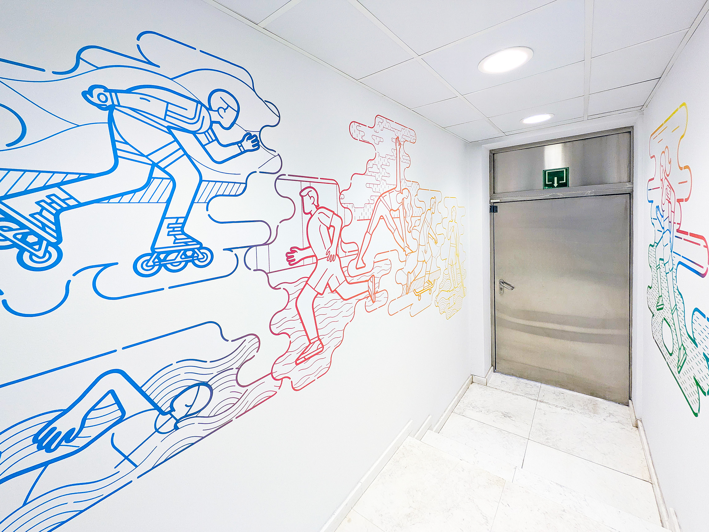 Por encargo de CBRE, la empresa que gestiona el edificio, realicé un mural ilustrado para decorar el pasillo que conecta el Paseo Marítimo de la Barceloneta con los vestuarios de la torre, utilizados por los trabajadores para cambiarse antes y después de realizar actividades deportivas.