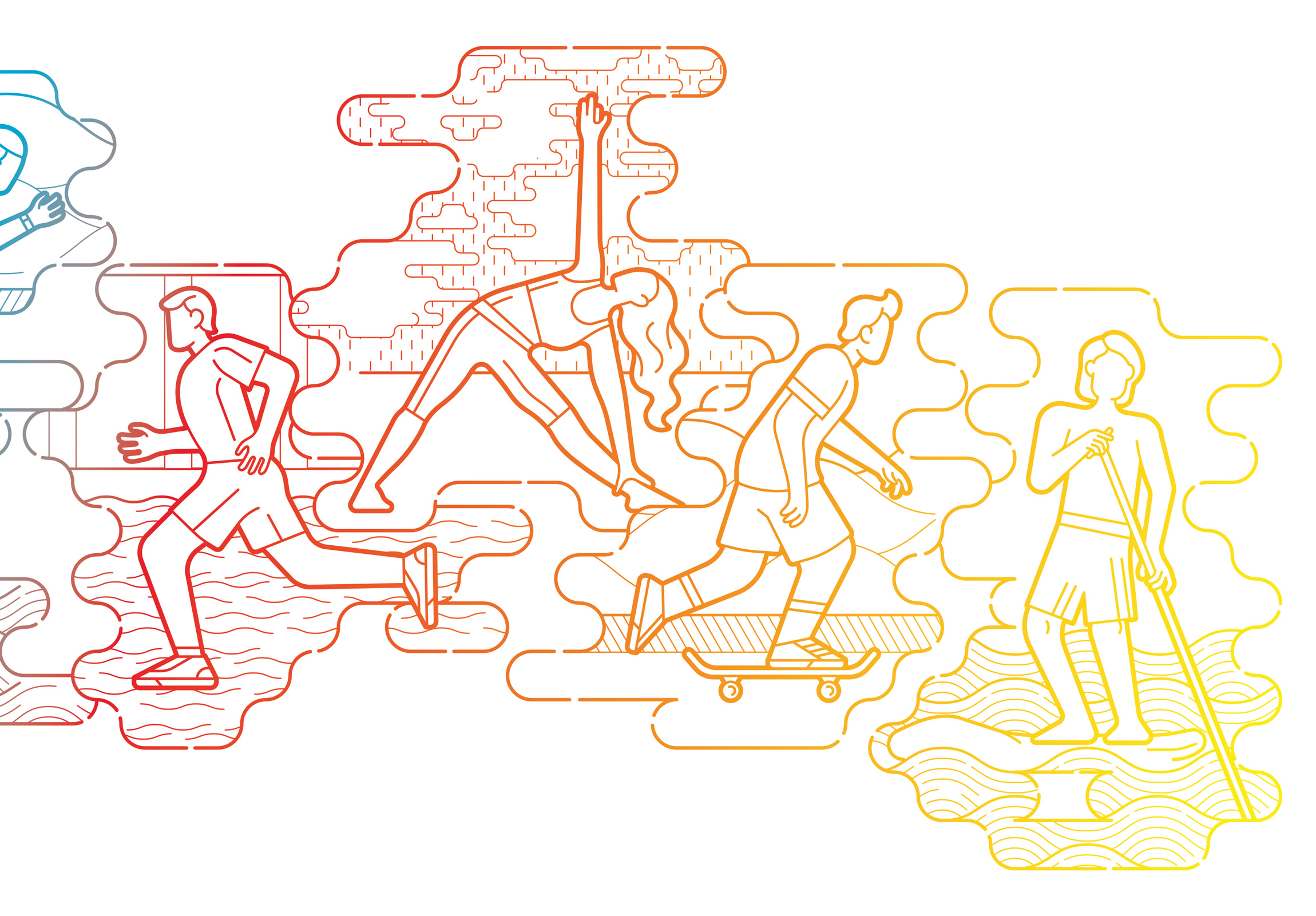 La ilustración representa las principales disciplinas deportivas que se practican a lo largo de la Barceloneta y fue diseñada siguiendo cuidadosamente las directrices del brandbook oficial de la Torre Mapfre. Utilicé la paleta cromática en degradado arcoíris y el estilo lineal continuo inspirado en su logotipo, garantizando coherencia con la identidad visual del edificio.